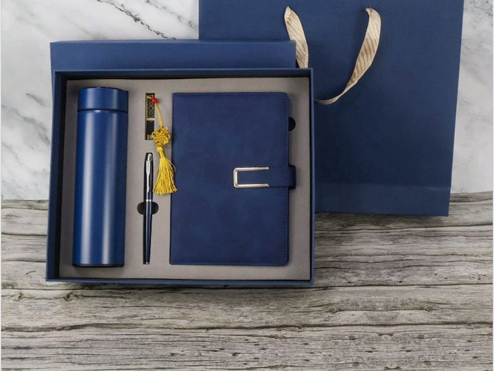 - A matching navy blue, professional-looking notebook or journal with a metallic silver-colored clasp closure.